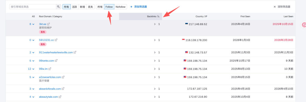 通过Semrush/Ahrefs也是一种查找外链的形式,当然在这之前是你要找到一些SEO表现好的同行网站,将他们网站的外链建设情况进行导出,但值得注意的是,并非他们所有的引荐域名都是能投稿的Guest Post外链,你需要鉴别,这里以Semrush为例,在你进入到竞争对手的引荐页面后,你需要手动选择Dofollow筛选,并且页面外链数上从低到高排(因为大部分Guest Post网站都是1-2条跳出链接到网站)。这样你就可以最大限度的筛选到竞争对手合适的Guest Post外链